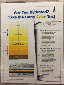 This is a pee chart where you compare to color of your urine going into the urinal with the chart. Note that the top, nearly water-like color says “optimal.” The only thing that is optimal for is spending your entire afternoon standing in front of that urinal and comparing the color of your pee to the chart. Sure, you’re going to miss class because you’re doing nothing but peeing all day, but you’re well hydrated, so congratulations?